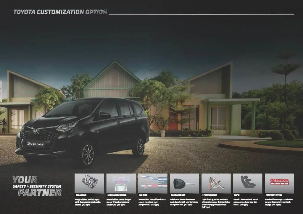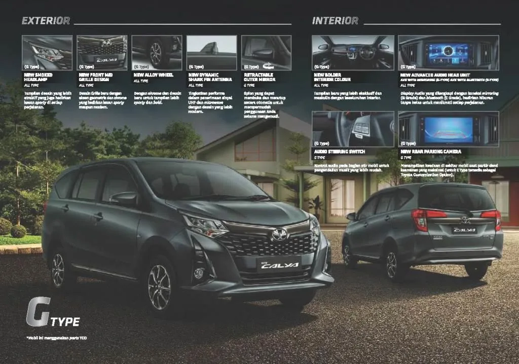 New Calya, Beyond Exterior. Compact MPV 7-seater dengan konsep desain yang stylish dan modern, semakin menambah kepuasan Anda dalam berkendara. New Calya merupakan mobil MPV (Multi Purpose Vehicle) dengan kapasitas tujuh penumpang ini memiliki slogan “Partner in Times” yang lebih mengutamakan sisi fleksibilitas di dalamnya.